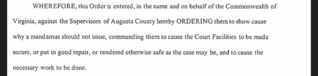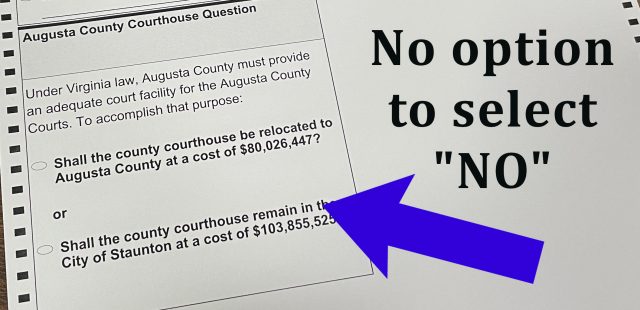 This entire issue stems from the fact that a judge ordered that Augusta County provide a safe courthouse for the county. Past board of supervisors neglected the existing courthouse to the point where millions of dollar are needed to repair or build new. The county actually hired a company which quoted $10million to repair the existing courthouse, but supervisors wanted a new courthouse, so they rigged an election.