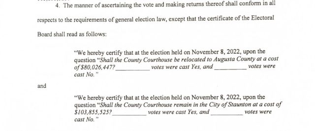 The writ for Augusta County’s 2022 courthouse referendum clearly stated that votes must be tallied as yes or no for each question. That means: Do you want to build a new courthouse in the city? Yes or no. Do you want to build a new courthouse in the county? Yes or no.